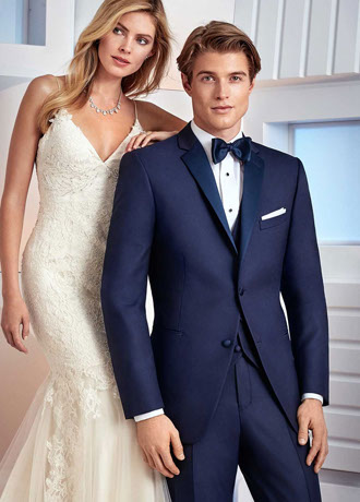 The Navy 'Sebastian' Tuxedo by Ike Behar Evening was expertly and aptly created in response to the growing demand for quality navy tuxedos. The notch lapels on the coat are self material with a thin satin indented trim around the edges. Other features include a single-breasted, two button front, satin besom pockets and side vents.