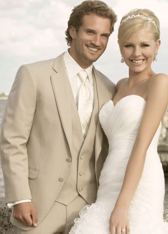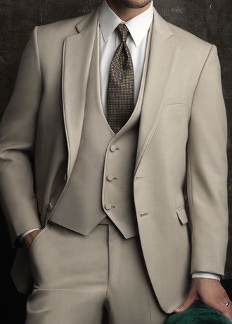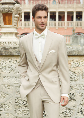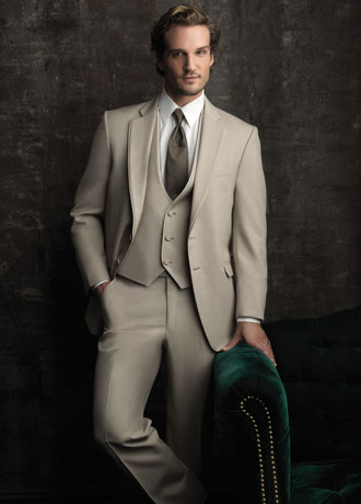 The Tan Grey 'Bartlett' Tuxedo by Allure Men was expertly and aptly created in response to the growing demand for quality tan tuxedos. The notch lapels on the coat are self material with a thin satin indented trim around the edges. Other features include a single-breasted, two button front, satin besom pockets and side vents.