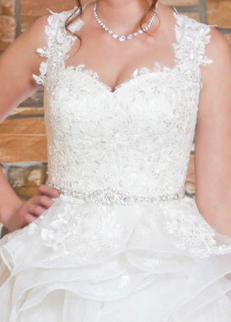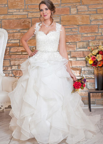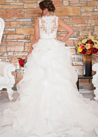 Brandi has a Sweetheart Neckline and Illusion Lace Back. The Skirt has Wide Horsehair Waterfall Ruffles.
