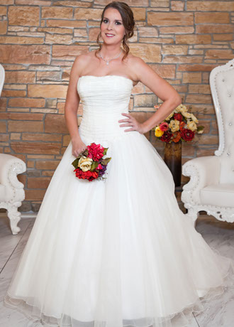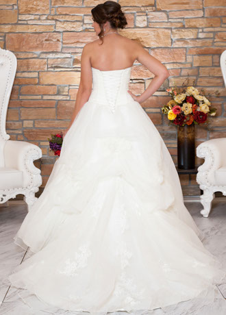 Misty Has a Gathered Lace Bodice with a Beaded Edge. The Organza Skirt has Scattered Lace Appliqués and Pick-Up Train.