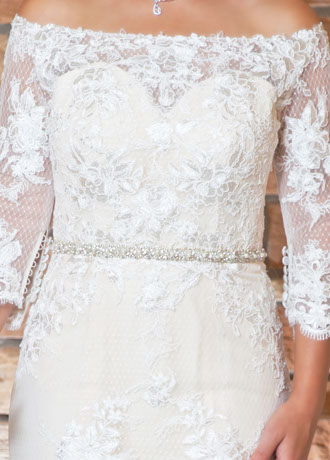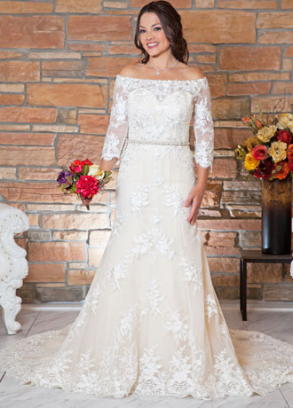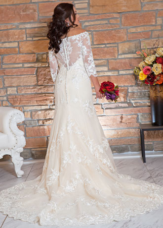 Natalie is a Gorgeous Fit-and-Flare Gown with an illusion Off-Shoulder Neckline. The Waterfall Lace Applique Train is Finished with a Perfect Scallop Lace Edge